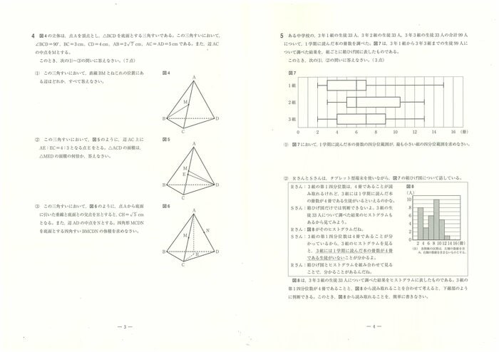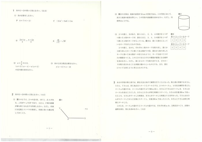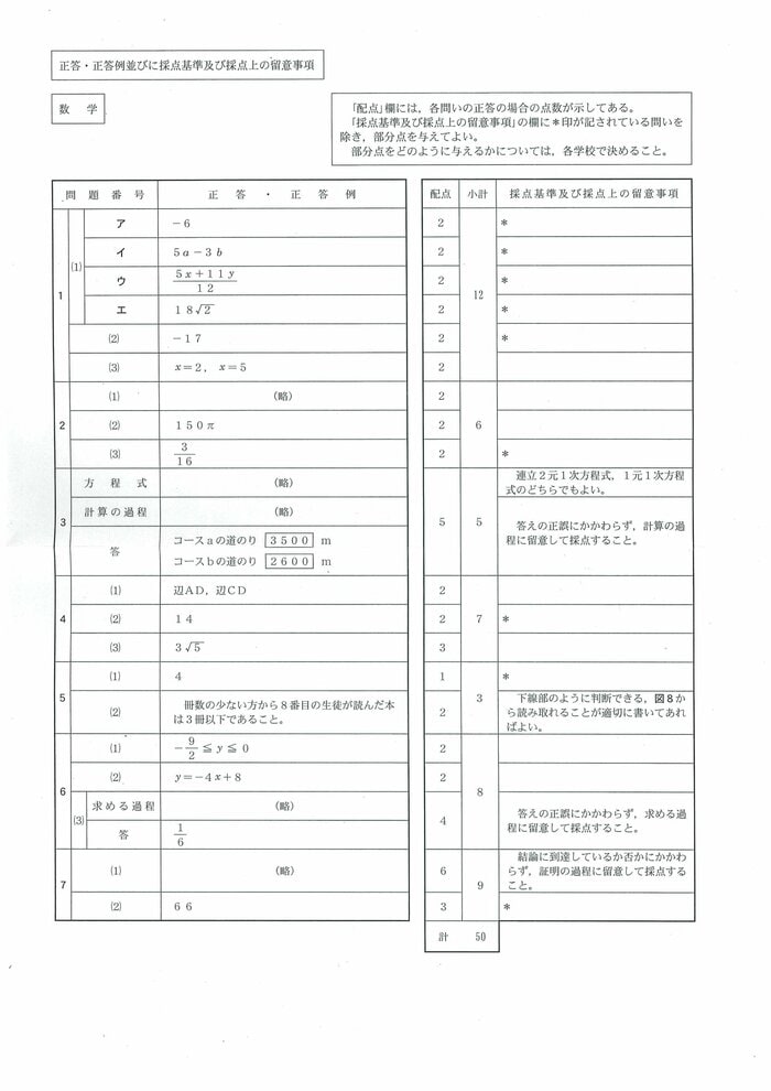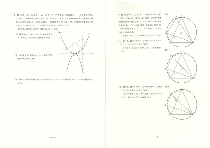 県教育委員会は数学に関する出題のねらいについて「1と2では数と式、図形及び確立に関する基礎的な力を、3では日常の事象を数学的にとらえる力を、4、5及び6では空間図形、データの分布及び関数についての理解の程度を、7では平面図形について論理的に考察する力を、それぞれみることにねらいを置いた。出題に当たっては、数学的活動を通して、事象を数学的にとらえ、表現し、考察処理する課程をみることができるようにした」としている。