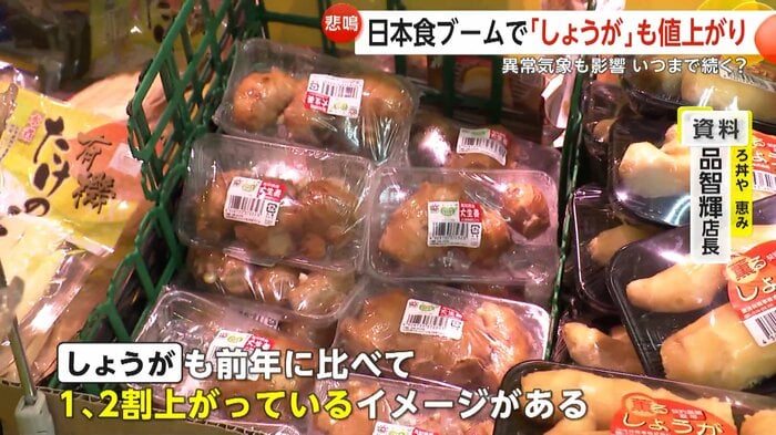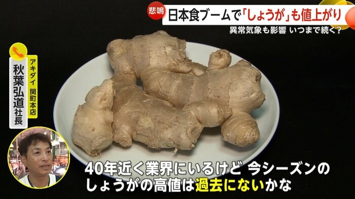 (原因は)産地の方の異常気象。夏の高温の影響で、しょうがも非常に高い。価格でいうと約3割、軒並みずっと高い状態が続いている。たぶん異例だと思います。40年近く業界にいるけど、今シーズンのしょうがの高値は過去にないかな。