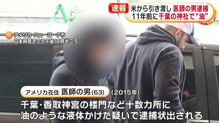 11年前に千葉県内の神社にある国の重要文化財などに油のような液体をかけた疑いで、アメリカ在住の男の身柄が現地当局から日本側に引き渡され、日本時間4日逮捕された。