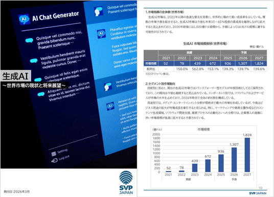 会員制マーケットリサーチサービスを提供している、株式会社SVPジャパン(本社:東京都中央区、代表取締役社長:橋本 雅、以下「SVPジャパン」)は、本日、SVP注目市場分析レポート「生成AI-世界市場の現状と将来展望-」を、会員企業向けに公開いたしました。