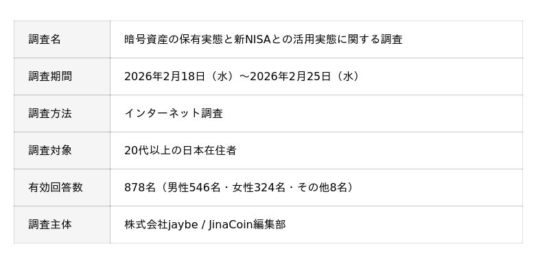 株式会社jaybe(本社:香川県高松市、代表取締役:水澤 誉往)が運営する暗号資産(仮想通貨)ニュースメディア「JinaCoin」(https://jinacoin.ne.jp/)は、20代以上の日本在住者878名を対象に、暗号資産の保有実態および新NISAとの活用・使い分けに関するインターネット調査を実施しました。