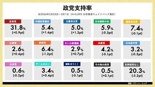 政党支持率では自民党が31.8%(前週比+0.9pt)で微増、「特に支持する政党はない」は20.3%(前週比-3.2pt)で減少となりました。