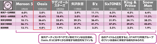 今回は、2025年に東京ドームおよび首都圏にある収容人数が5万人以上のスタジアで実施された公演を対象に調査を行いました。分析には、10m単位でエリアを指定し、人流を計測できるプラットフォーム「Location AI Platform」を活用。提携スマートフォンアプリから取得した位置情報ビッグデータを基に、来場者の属性や滞在時間などを把握しました。その一つとして来場時間を分析したところ、25年、東京ドームで16年ぶりに来日公演を開いたOasisは、参加者の約半数が3時間前までに来場。グッズの購入などを含め、ファンがいかに前のめりだったかがデータからも浮き彫りになりました。