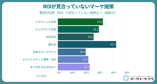 マーケティング施策全般への投資意欲が強まる一方で、施策ごとの手応えについては評価が分かれています。現在実施している施策の中で「費用対効果(ROI)が見合っていない」と感じるものを聞くと、「展示会(42.7%)」がトップとなりました。次いで「リスティング広告(33.0%)」、「ディスプレイ広告(30.1%)」、「SNS広告(26.2%)」といった広告施策が挙がっています。