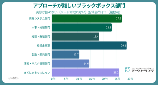 では、外部からの接触が難しい「聖域(ブラックボックス)」となっているのはどの部門なのでしょうか。「外部からのアプローチがとくに難しい、あるいは実態が掴めないと感じる『聖域部門』」を聞いたところ、企業の意思決定の中枢である「経営企画室(29.1%)」、社内システムを統制する「情報システム部門(27.2%)」、組織管理を担う「人事・総務部門(23.3%)」が上位に並びました。