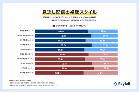 次に、2025年にスポーツを配信で観戦した人のうち、見逃し配信を利用した678人を対象に「見逃し配信の視聴スタイル」について聞いたところ(複数回答可)、「倍速」「ハイライト」「スキップや早送り」のいずれかを選択したタイパ重視の視聴は、男女ともに50代が最も低く60%未満にとどまったものの、全性年代で半数以上がタイパを重視した視聴スタイルを取り入れていることが分かりました。