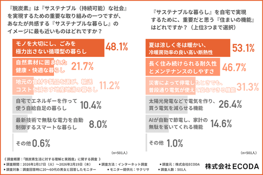 この結果は、サステナブルな住まいに対して、環境配慮だけでなく日々の快適さや長期的な安心感を求めていることを反映しています。