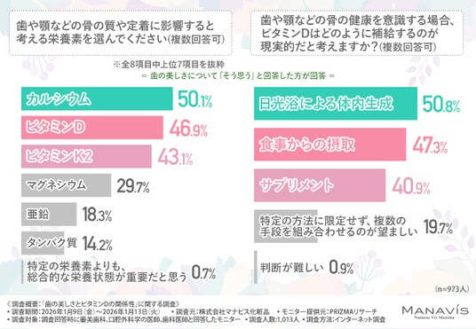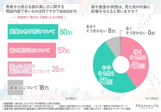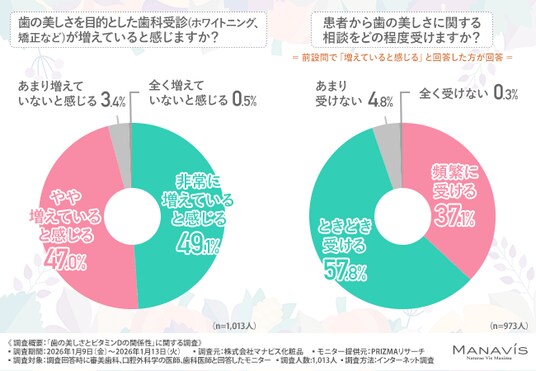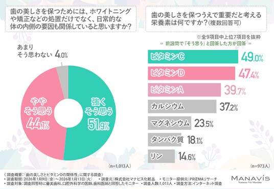 株式会社マナビス化粧品(所在地:千葉県浦安市、代表取締役社長:兼子 慎一)は、審美歯科、口腔外科学の医師、歯科医師を対象に、「歯の美しさとビタミンDの関係性」に関する調査を実施しました。