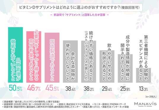 最後に、前の質問で『サプリメント』と回答した方に、「ビタミンDサプリメントはどのように選ぶのがおすすめか」と尋ねたところ、『品質管理が徹底されていること(50.5%)』と回答した方が最も多く、『必要量をしっかり補える高含有量であること(46.7%)』『国内製造であること(45.5%)』となりました。
