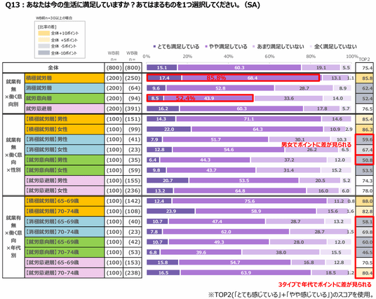●最も満足度が高いのは積極就労層で8割、最も低いのは就労意向層で5割。今の生活に満足をしているか尋ねたところ、積極就労層が85.8%、就労忌避層が76.5%、消極就労層が62.4%、就労意向層が52.4%と続いた。