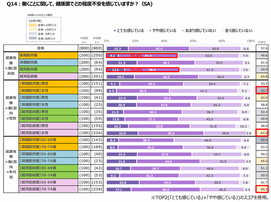 ● 健康面の不安を持っているのは5割で、積極就労層と同水準。(調査結果14.)