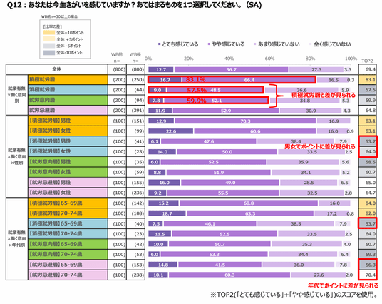 ● 今生きがいを感じているのは6割で、最も高い積極就労層と20ポイント以上の差。(調査結果12.)
