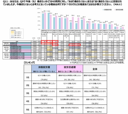 ● 今後、働きたくない理由は、 「もう十分働いたから」 やプライベートを重視したい要素が上位。(調査結果11.)