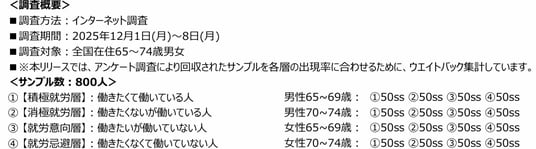 深刻な人手不足が続く中、多様な人材活用の一つとしてシニア層への期待が高まっています。シニアといっても年齢の幅は広いですが、昨今では仕事や日常生活の中に生きがいを見いだしながら前向きに過ごしている方も多く、70歳を過ぎても働き続ける人が増えています。こうした状況を踏まえ、「アラウンド古希世代(65~74歳)」の価値観や仕事に対する考え方を明らかにすることで、“70歳の壁”を越えて働ける環境づくりや、より良いマッチングにつなげたいと考え、本調査を実施しました。