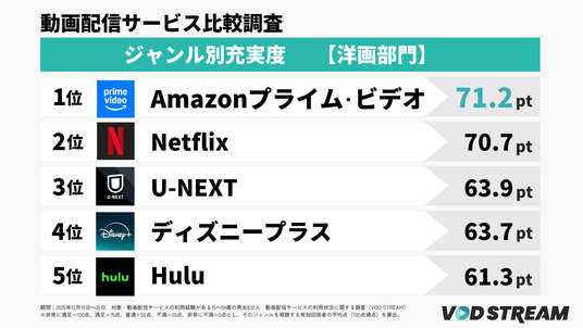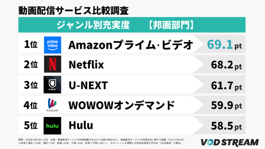 「Amazonプライム・ビデオ」は洋画・邦画・アニメ・バラエティなど複数のジャンル別充実度部門で1位を獲得した一方、発見体験の質に関する評価では5位にとどまる結果となりました。