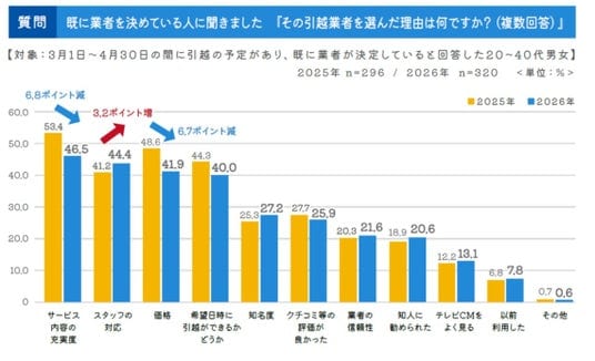 1.9ポイント増加しています。「業者の信頼性」や「以前利用した」も増加していることから、対応の良さや安心感、実際の利用経験など、信頼性に関わる要素が引越業者選びにおいて、より重視されていることがうかがえます。