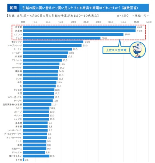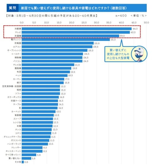 引越は大型家電の買い替え・買い足し検討のタイミング。リユース品購入は少ない家具や家電について、引越の際に「買い替えや買い足し」を行ったものは冷蔵庫が45.0%と一番多く、次いで洗濯機44.8% 、エアコン40.0% 、テレビ30.8%と大型家電と呼ばれる家電4品目が上位に挙がりました。