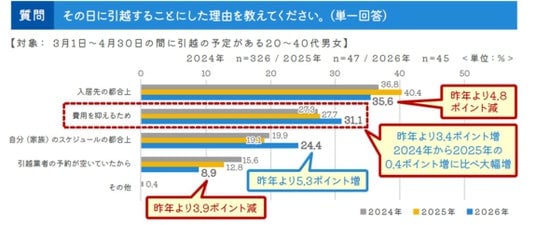 「引越予定日をその日にした理由」では「費用を抑えたい」が31.1%と昨年より3.4ポイント増加しました。一昨年・昨年の0.4ポイント増と比べると大幅に増加しています。物価高の影響で引越費用が高騰する中、少しでも安い時期を求めた結果が3月上旬の引越増加傾向につながったと考えられます。