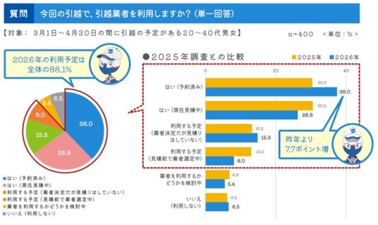 「サービス内容の充実度」が引き続き首位。スタッフ対応など“信頼性”重視が拡大今回の引越で引越業者を利用するかどうか?」の質問に対しては、88 .1%の人が「利用する」「利用する予定」と回答しました。「利用する」の中でも「予約済み」と答えた人が昨年より7.7ポイント上昇。混雑を予想し、早めに業者を選定して予約まで行う傾向が見られました。