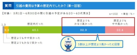 引越費用が「想定より高かった」との回答が合計55.3%と予算超過の傾向に