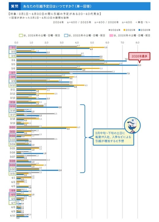 引越予定日を日別で確認してみると、昨年(2025年)のアンケート調査では3月5日(水)を予定する人が最多で、今年も同じ3月5日(木)に引越を予定していると回答した人が最も多く、次いで3月4日(水)と7日(土)が多くなるという結果でした。