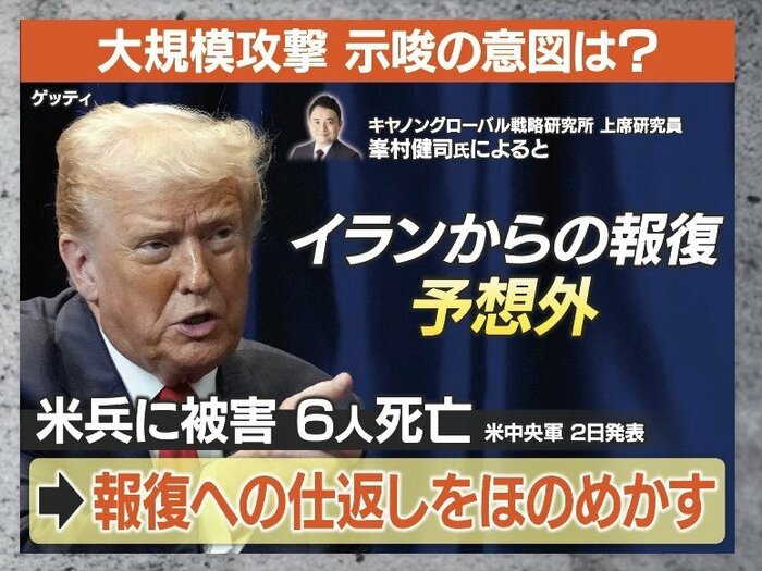 キヤノングローバル戦略研究所・上席研究員の峯村健司氏によると、トランプ大統領にとってイランからの報復は予想外で、こうした焦りから報復への仕返しをほのめかしたのではないかということです。