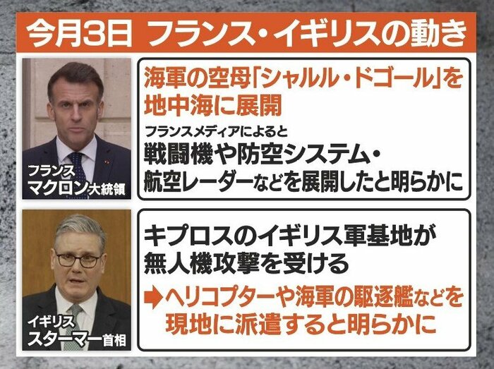こうした中、フランスメディアによると、フランスのマクロン大統領が3日、海軍の空母「シャルル・ドゴール」を地中海に展開。戦闘機や防空システム・航空レーダーなどを展開したと明らかにしました。