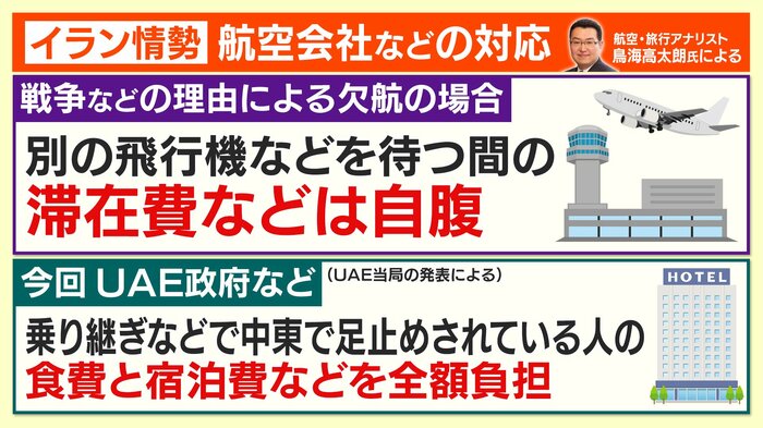 しかし今回UAE政府などは、乗り継ぎなど中東で足止めされている人の食費と宿泊費などを全額負担すると表明しています。