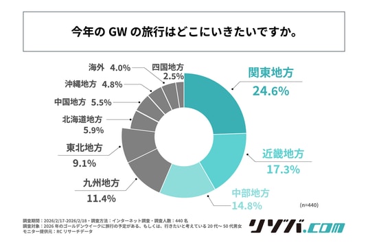 続いて、「2026年のGWの旅行はどこに行きたいか」を尋ねる設問への回答では、1位が「関東地方」で24.6%、2位が「近畿地方」で17.3%、3位が「中部地方」で14.8%という結果になりました。この結果から、2026年のGWに旅行の意向がある20代~50代男女の約4人に1人が、2026年のGWに行きたい旅行先として「関東地方」を挙げていることが判明しました