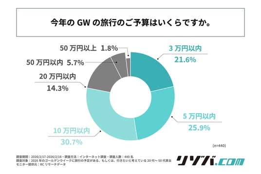 また、「2026年のGWの旅行の予算はいくらか」を尋ねる設問への回答では、1位が「10万円以内」で30.7%、2位が「5万円以内」で25.9%、3位が「3万円以内」で21.6%という結果になりました。この結果から、2026年のGWの旅行の予算は「10万円以内」が最多であることがわかりました。