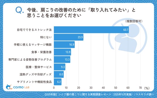 「自宅でできるストレッチ法」(60.7%)が突出し、「特にない」(23.9%)が続きました。