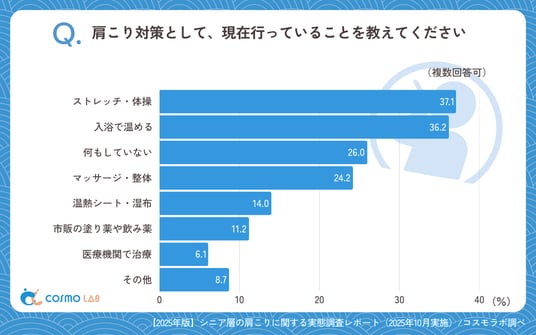最多は「ストレッチ・体操」(37.1%)で、「入浴で温める」(36.2%)が僅差で続きました。「何もしていない」(26.0%)、「マッサージ・整体」(24.2%)も一定数において見受けられます。