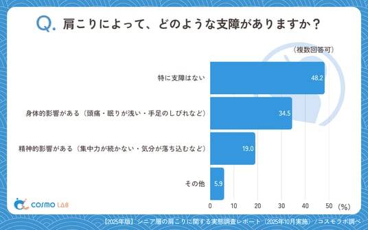 「特に支障はない」(48.2%)が最多である一方、「身体的影響がある(頭痛・眠りが浅い・手足のしびれなど)」(34.5%)が続き、「精神的影響がある(集中力が続かない・気分が落ち込むなど)」(19.0%)も一定数となりました。