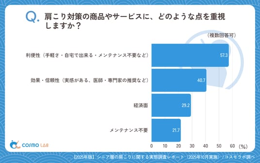 「利便性(手軽さ・自宅で出来る・メンテナンス不要など)」(57.3%)が最も重視され、「効果・信頼性(実感がある、医師・専門家の推奨など)」(40.7%)が続きました。「経済面」(29.2%)も一定数見受けられました。