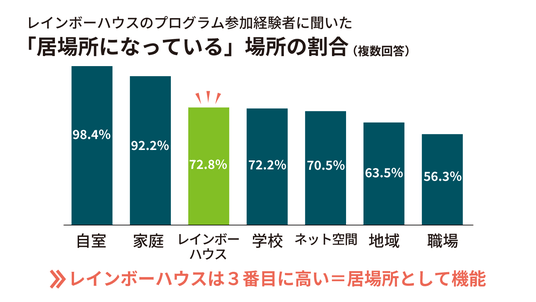 レインボーハウスのプログラムに参加した経験がある回答者のうち72.8%が、「レインボーハウスは自分にとって居場所になっている」と回答しています(複数回答)。これは、「自室」、「家庭」に次いで3番目に高い割合です。