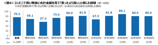 コンビニでの買い物後、合計金額を見て「思ったより高い」と感じたことのある割合は76.2%。