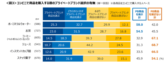 「水・ミネラルウォーター」「お茶」をコンビニで購入する際に、プライベートブランド商品を選ぶ人は半数を超える。一方、「コーヒー」「ジュース」は選ばない人が7割弱で、ナショナルブランドへのこだわりがみられる。<図3>
