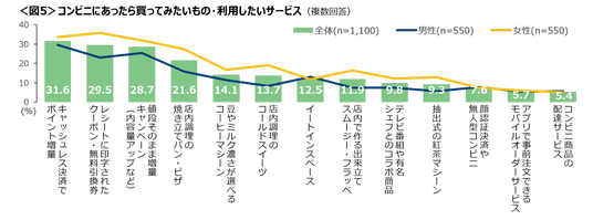 女性は、「レシートに印字されたクーポン・無料引換券」や、店内調理の「焼き立てパン・ピザ」「コールドスイーツ」「スムージー・フラッペ」への関心が高く、コンビニに利便性だけではなく専門店のような本格的な味わいを求めている様子がうかがえる。<図5>