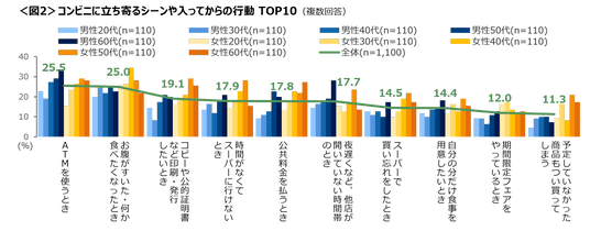 男性60代は「ATMを使うとき」「夜遅くなど、他店が開いていない時間帯のとき」、女性20~30代は「期間限定フェアをやっているとき」、女性40代は「お腹がすいた・何か食べたくなったとき」、女性50~60代は「コピーや公的証明書など印刷・発行したいとき」に加えて、女性50代は「時間がなくてスーパーに行けないとき」、女性60代は「公共料金を払うとき」が高く、性年代別に差がみられた。<図2>