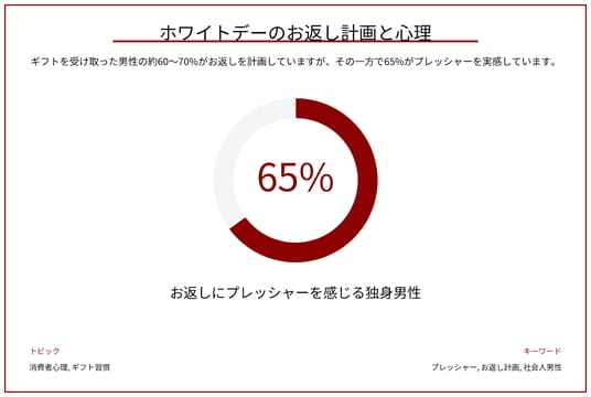 一方で独身男性の約65%が「ホワイトデーのお返しにプレッシャーを感じている」