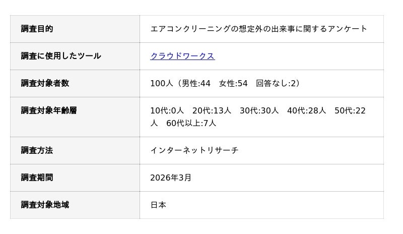 おうちにプロでは、エアコンクリーニングでお悩みの方により有益な情報を提供するために、「エアコンクリーニングの想定外の出来事に関する独自調査」を実施しました。アンケート調査の概要は以下の通りです。