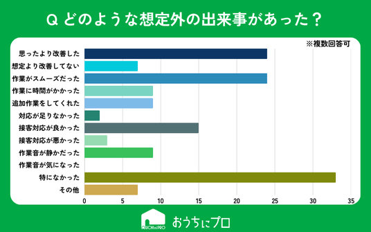 - 主な想定外の出来事としては「思った以上に改善した」「作業がスムーズに進んだ」「接客対応が良かった」ことが挙げられた。