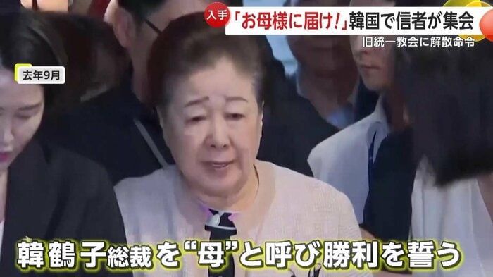尹錫悦(ユン・ソンニョル)前政権側に金品を渡したとして裁判中の韓鶴子(ハン・ハクチャ)総裁を「母」と呼び勝利を誓っていた。