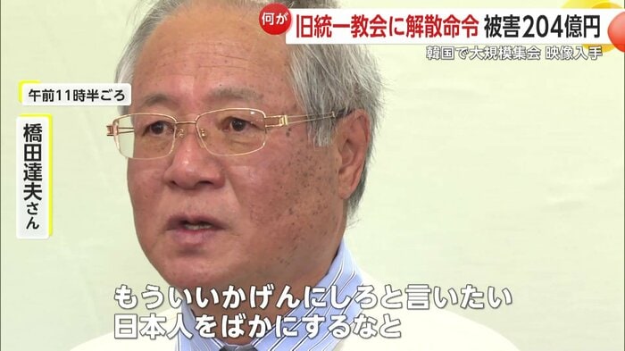 元妻が多額の献金を行うなど被害を訴えてきた橋田達夫さんは、教団に対して「もういいかげんにしろと言いたい。日本人をばかにするなと。信者の献金で彼らは生きていたわけですから、一人一人の信者に返していきなさいと」と語った。