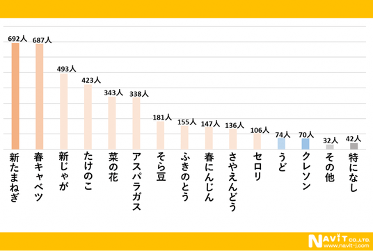 「好きな春野菜は何ですか?」という質問を複数選択可で行ったところ、「新たまねぎ」が692人、「春キャベツ」が687人、「新じゃが」が493人と続きました。新たまねぎや春キャベツが人気のようです。