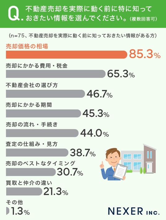「売却価格の相場」で85.3%と圧倒的な支持を集めました。「売却にかかる費用・税金」で65.3%、「不動産会社の選び方」で46.7%という結果になりました。