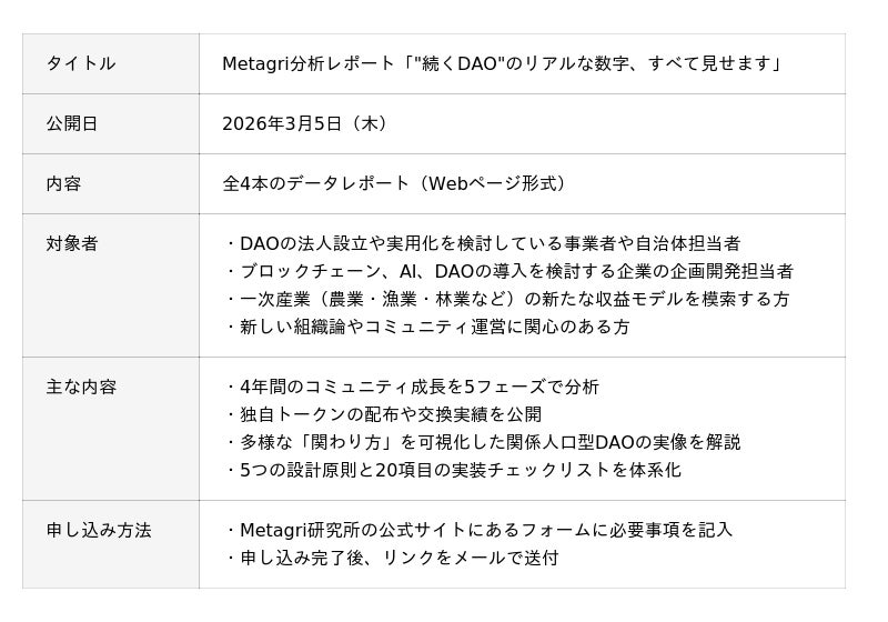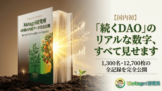 農業web3コミュニティ「Metagri研究所」(運営:株式会社農情人、本社:千葉県船橋市、代表取締役:甲斐雄一郎)は、設立4周年を記念したMetagri分析レポート『"続くDAO"のリアルな数字、すべて見せます』をリリースいたします。本レポートは、当社が2025年に無料公開したweb3リサーチペーパー『地方創生と一次産業におけるNFT・DAO・AI活用戦略』の実証データ編です。同ペーパーが「DAOをどう始めるか」を解説したのに対し、本レポートは「DAOをどう続けるか」を4年分の一次データで示す、国内初の取り組みです(※1)。