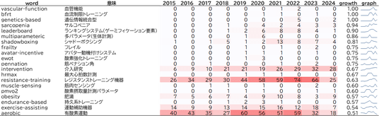 運動機器以外には「avatar-incentive(アバター動機付けシステム)」、「leaderboard(ランキングシステム)」など、ゲームフィケーションおよびモチベーションに関する用語が少数ながら増加しています。また「intervation(介入研究)」、「sarcopenia(サルコペニア)」、「obesity(肥満)」、「farailty(フレイル)」のように、特定疾患の研究に関するものも見られます。とくに「sarcopenia」は加齢や疾患等により筋肉量・筋力が低下する病気であり、頻度自体は少ないものの出現割合は急上昇しています。
