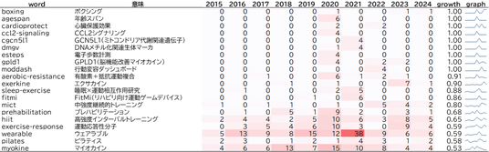 図3はフィットネス領域における特許のキーワード分析結果です。成長率(growth)は2020年以降の出現数を、2015年~2024年の出現数で割った比率です。0.5以上であれば近年増加しているキーワードとなり、1に近いほど近年になって出現し始めたワードとなります。