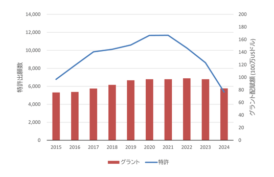 フィットネス関連技術の特許出願動向は、2015年から2021年にかけて出願数は約1.7倍に増加したものの、2021年以降はのびなやんでいます。一方、グラントの投資額は2015年以降継続的に増加しており、米国がけん引役となりながら、日本も一定水準の投資を維持しています。これらのことから、既存のフィットネス技術は成熟期にさしかかりつつある一方、次世代にむけた基礎研究や開発投資は着実に進んでいることがわかります。